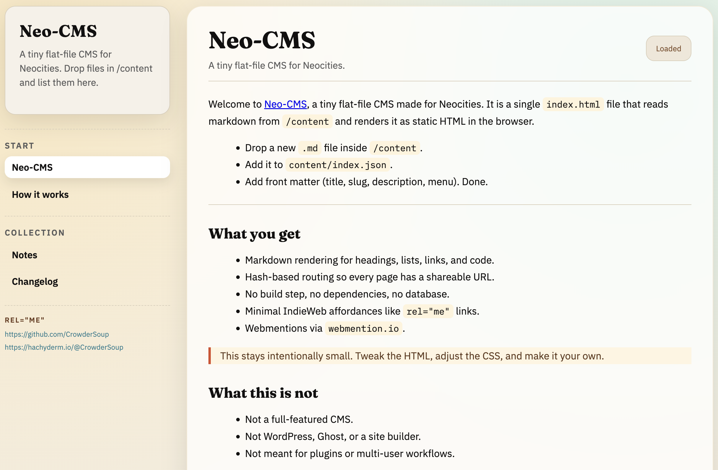 I’ve been wanting a dead‑simple way to publish small personal sites on Neocities without build tools, databases, or plugins. Today I’m sharing Neo‑CMS — a tiny flat‑file CMS that renders Markdown right in the browser.