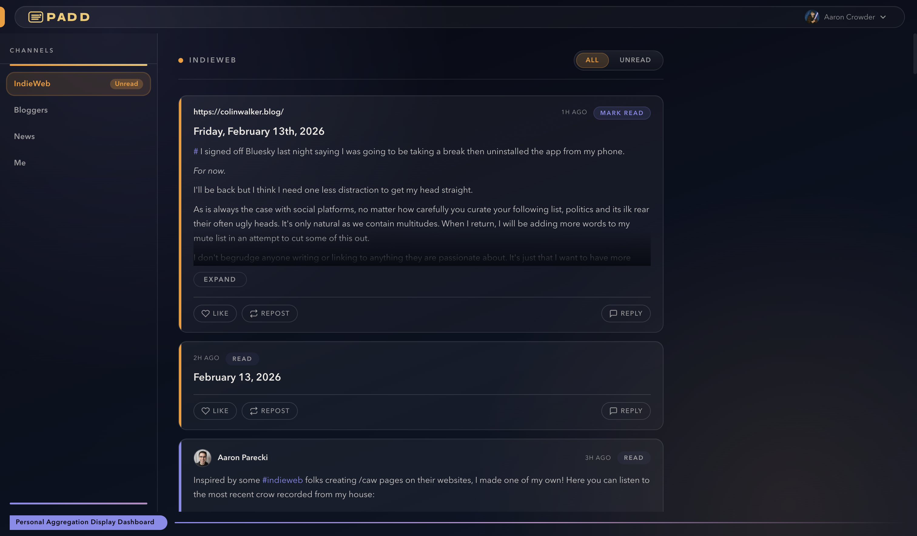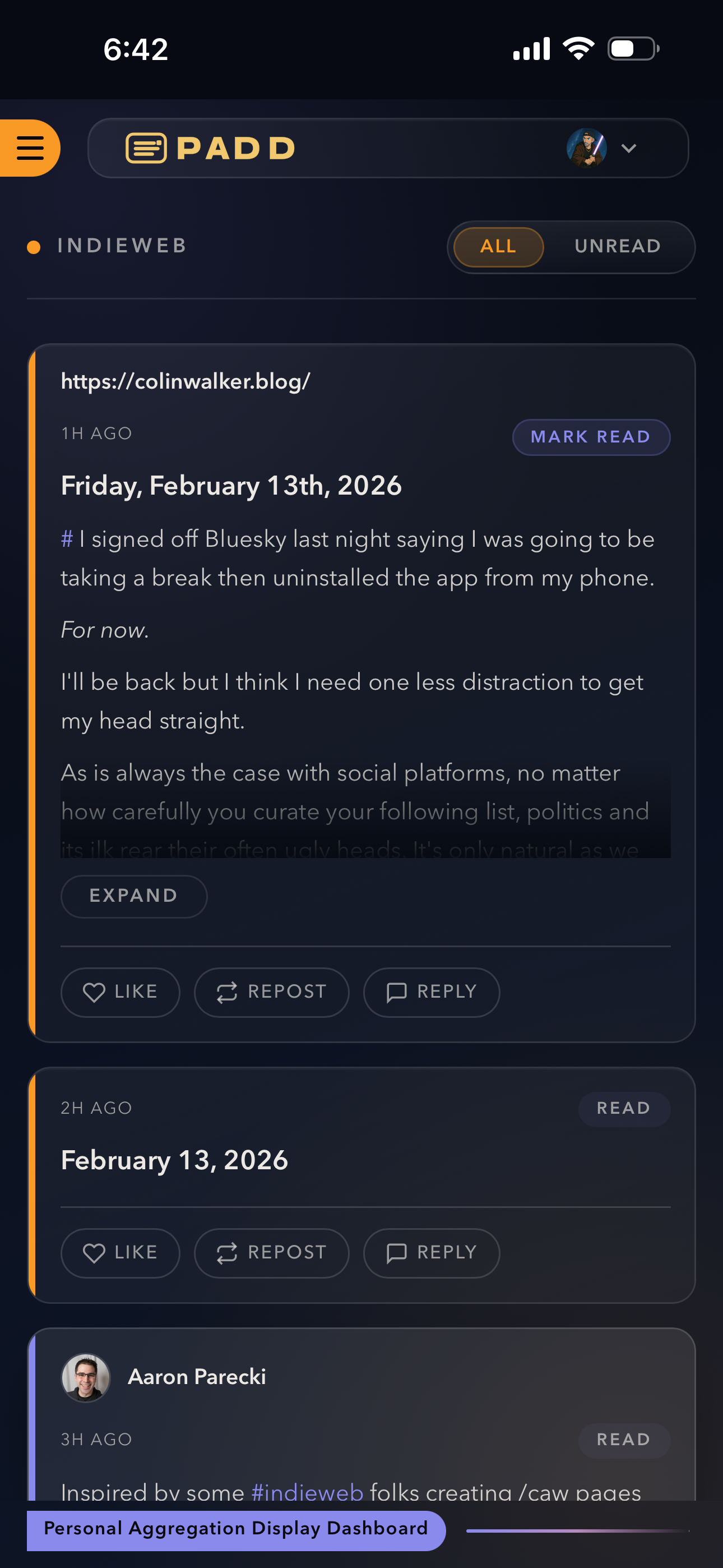 Padd is a Microsub Reader. The biggest thing this one does over others I've used is save my replies in-line. So I don't forget if I've liked a post already, or replied, etc.