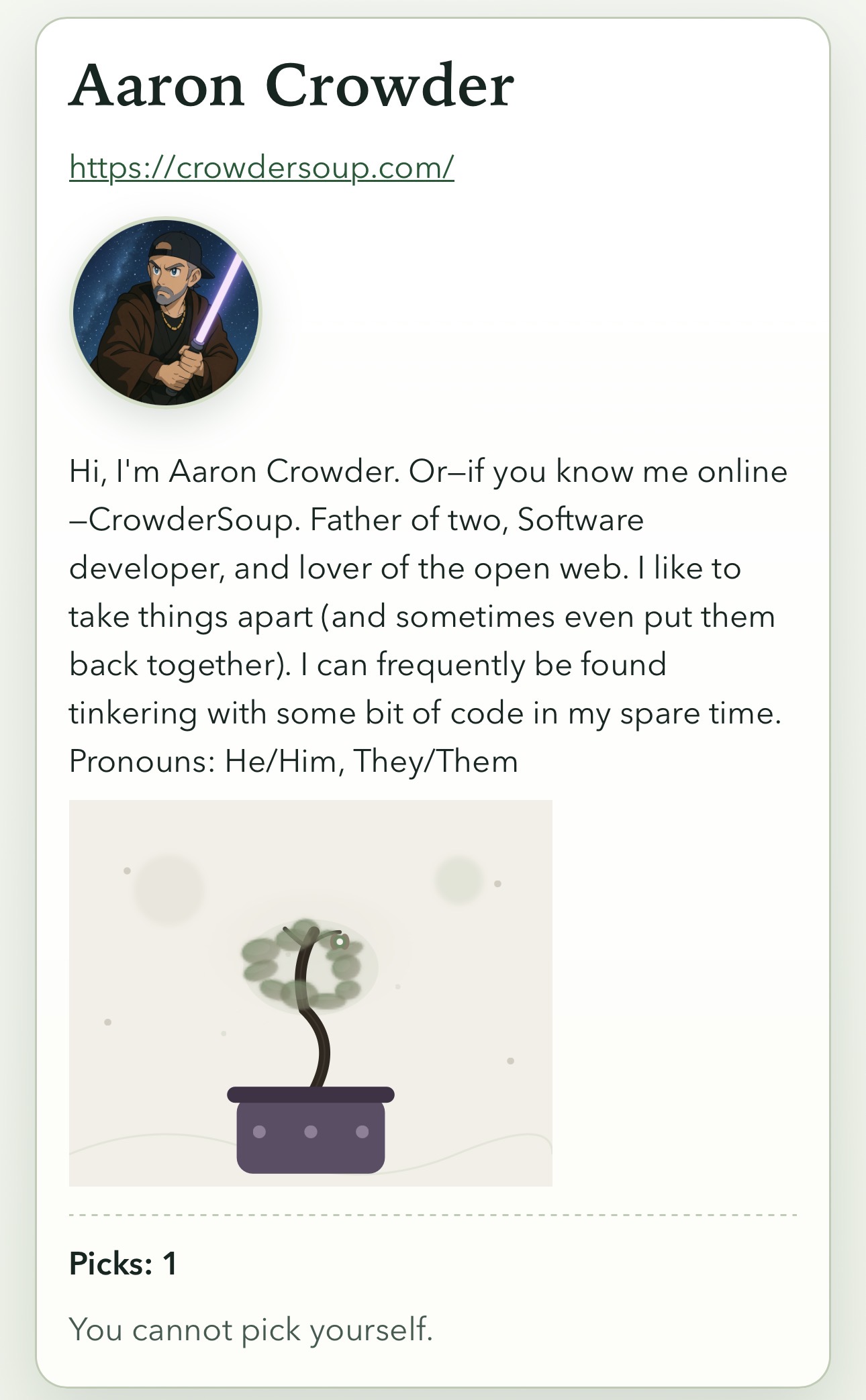 You could use your website to sign up for https://gardn.website if you wanted to. If you did you could even go pick my plant and help yours grow by bookmarking URLs.