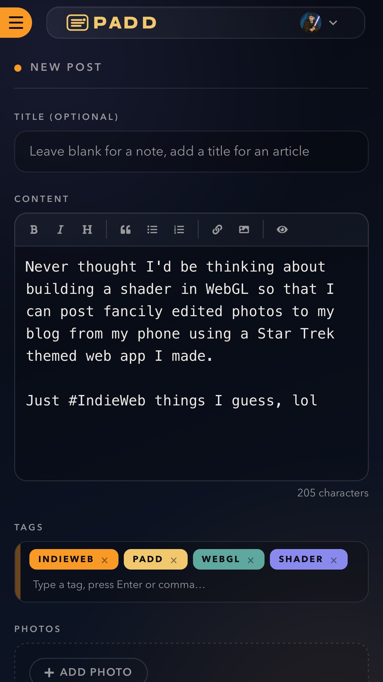 Never thought I'd be thinking about building a shader in WebGL so that I can post fancily edited photos to my blog from my phone using a Star Trek themed web app I made.
